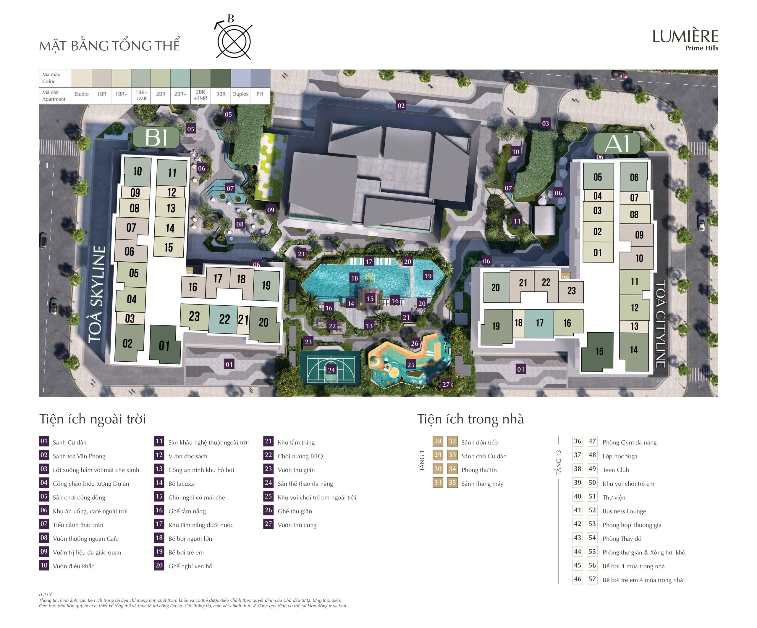 Sức hút của Lumiere Prime Hills còn đến từ chuỗi 57 tiện ích “indoor” & “outdoor” đẳng cấp. Trong đó, các tiện ích ngoài trời “outdoor” tập trung chủ yếu giữa 2 tòa nhà, bao gồm: khu bể bơi ngoài trời mang phong cách “resort”, sân thể thao đa năng, sân chơi trẻ nhỏ, khu vực ăn uống, cafe ngoài trời, tiểu cảnh thác nước vv… còn các tiện ích “indoor” nằm ở tầng 1 và 13 của 2 tòa nhà, bao gồm: sảnh lễ tân, phòng tiếp khách, thư viện, phòng tập gym, phòng tập yoga, phòng xông hơi khô, bể bơi bốn mùa. Chuỗi tiện ích đẳng cấp được quản lý chuyên biệt bởi Masterise Homes và chỉ dành cho cư dân Lumiere Cổ Loa, góp phần đưa 2 tòa căn hộ tại đây trở thành biểu tượng sống tinh anh trong đại đô thị toàn cầ
