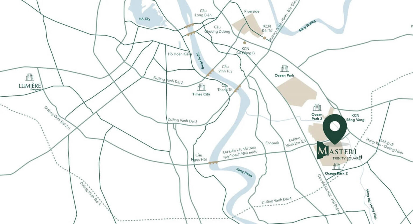 Masteri Trinity Square tọa lạc tại trung tâm khu thương mại của Ocean Park 2 – Ocean City, huyện Văn Giang, Hưng Yên, sở hữu vị trí chiến lược với khả năng kết nối nhanh chóng đến các khu vực trọng điểm: