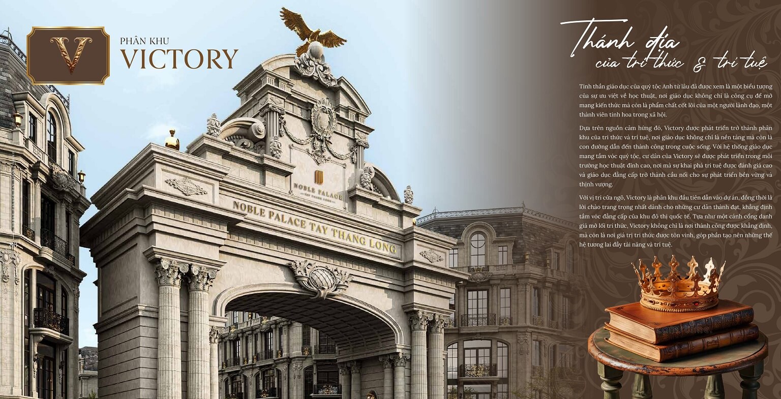 Dựa trên nguồn cảm hứng đó, Phân khu Victory Noble Palace Tây Thăng Long được phát triển trở thành phân khu của tri thức và trí tuệ, nơi giáo dục không chỉ là nền tảng mà còn là con đường dẫn đến thành công trong cuộc sống. Với hệ thống giáo dục mang tầm vóc quý tộc, cư dân của Victory sẽ được phát triển trong môi trường học thuật đỉnh cao, nơi mà sự khai phá trí tuệ được đánh giá cao và giáo dục đẳng cấp trở thành cầu nối cho sự phát triển bền vững và thịnh vượng. Với vị trí cửa ngõ, Victory là phân khu đầu tiên dẫn vào dự án, đồng thời là lời chào trang trọng nhất dành cho những cư dân thành đạt, khẳng định tầm vóc đẳng cấp của khu đô thị quốc tế.