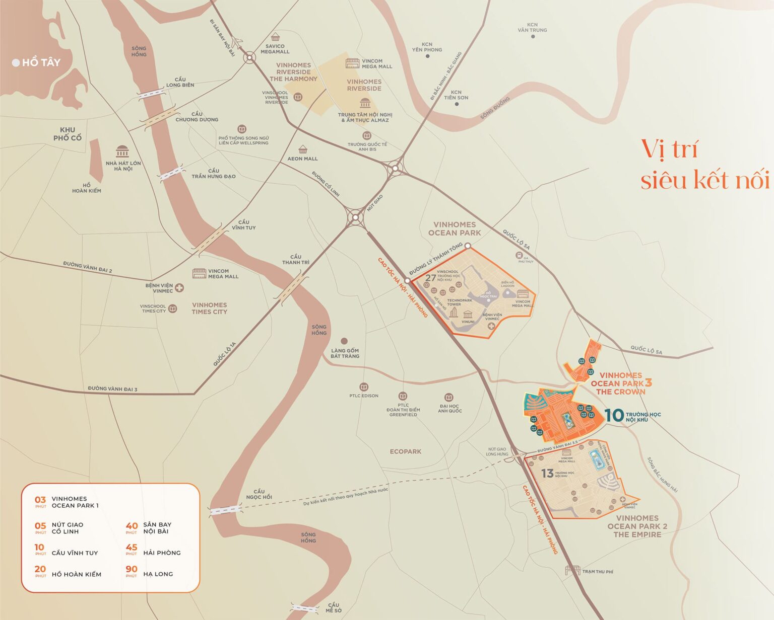 Vinhomes Ocean Park 2 – The Empire được bao quanh bởi nhiều mô hình, dự án phát triển khác, giúp cư dân có cơ hội trải nghiệm nhiều dịch vụ và tiện ích hấp dẫn từ ngoại khu. Bên cạnh đó, Vinhomes Ocean Park 2 – The Empire kề cận với đại đô thị Vinhomes Ocean Park Gia Lâm, tiếp giáp trực tiếp với 2 tuyến quốc lộ 5A, 5B, khu đô thị Đặng Xá và khu đô thị EcoPark, cách trung tâm thương mại Aeon Mall Long Biên chỉ 8km